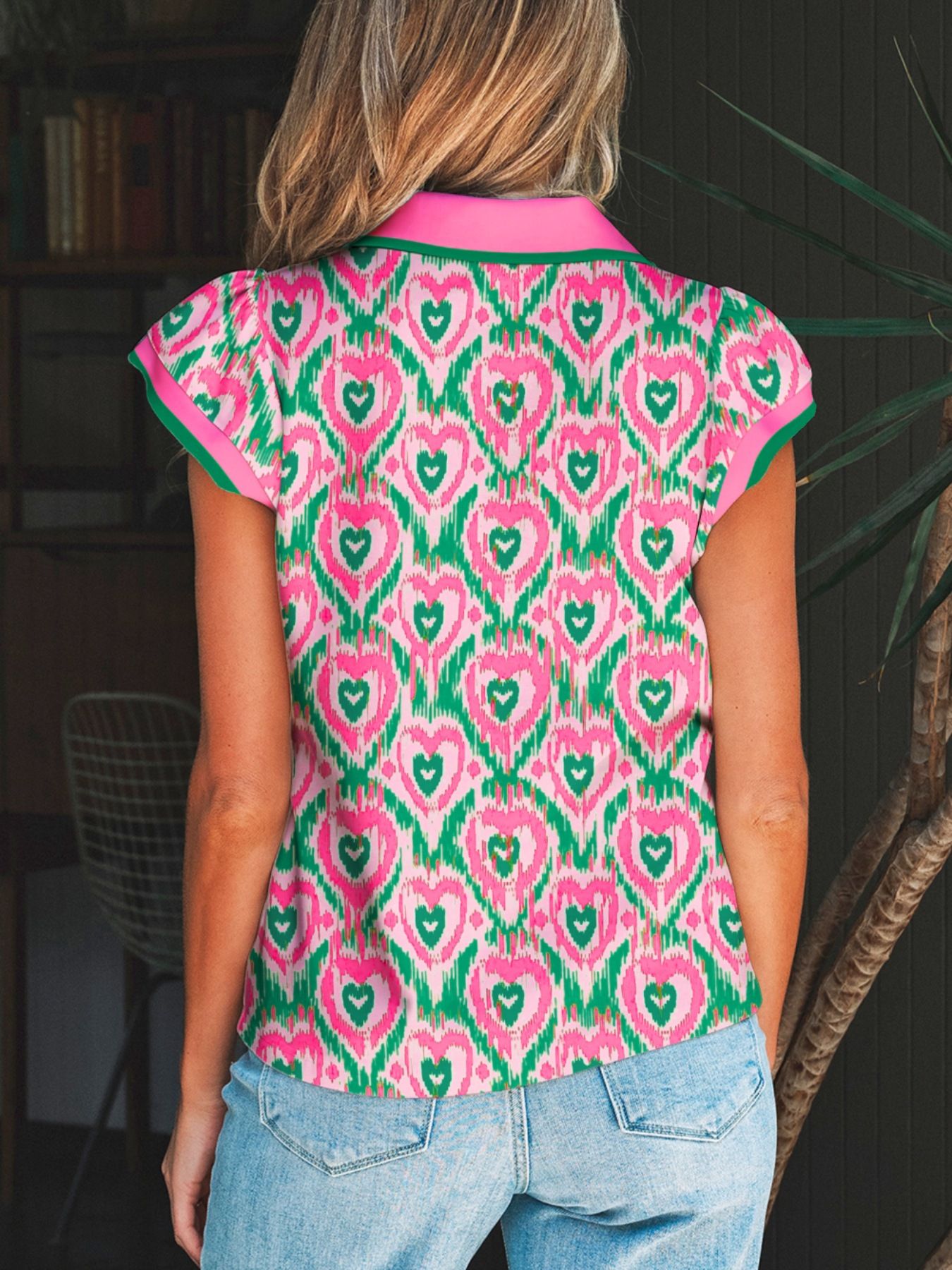 Abstract Heart In Heart Print Striped Trim Polo Collar Short Sleeve Blouse