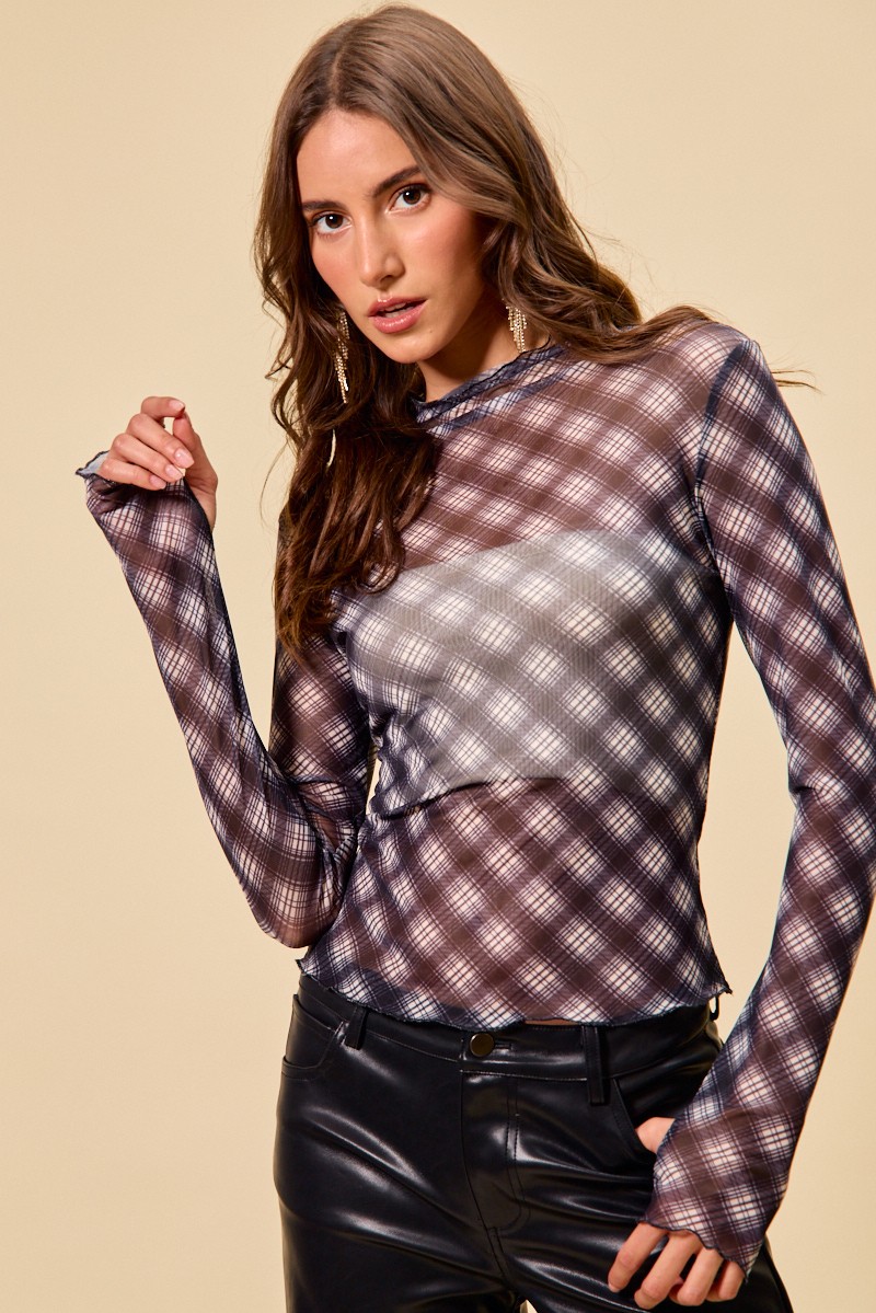 So Me Plaid Mesh Knit Long Sleeve Top With Thumb Opening