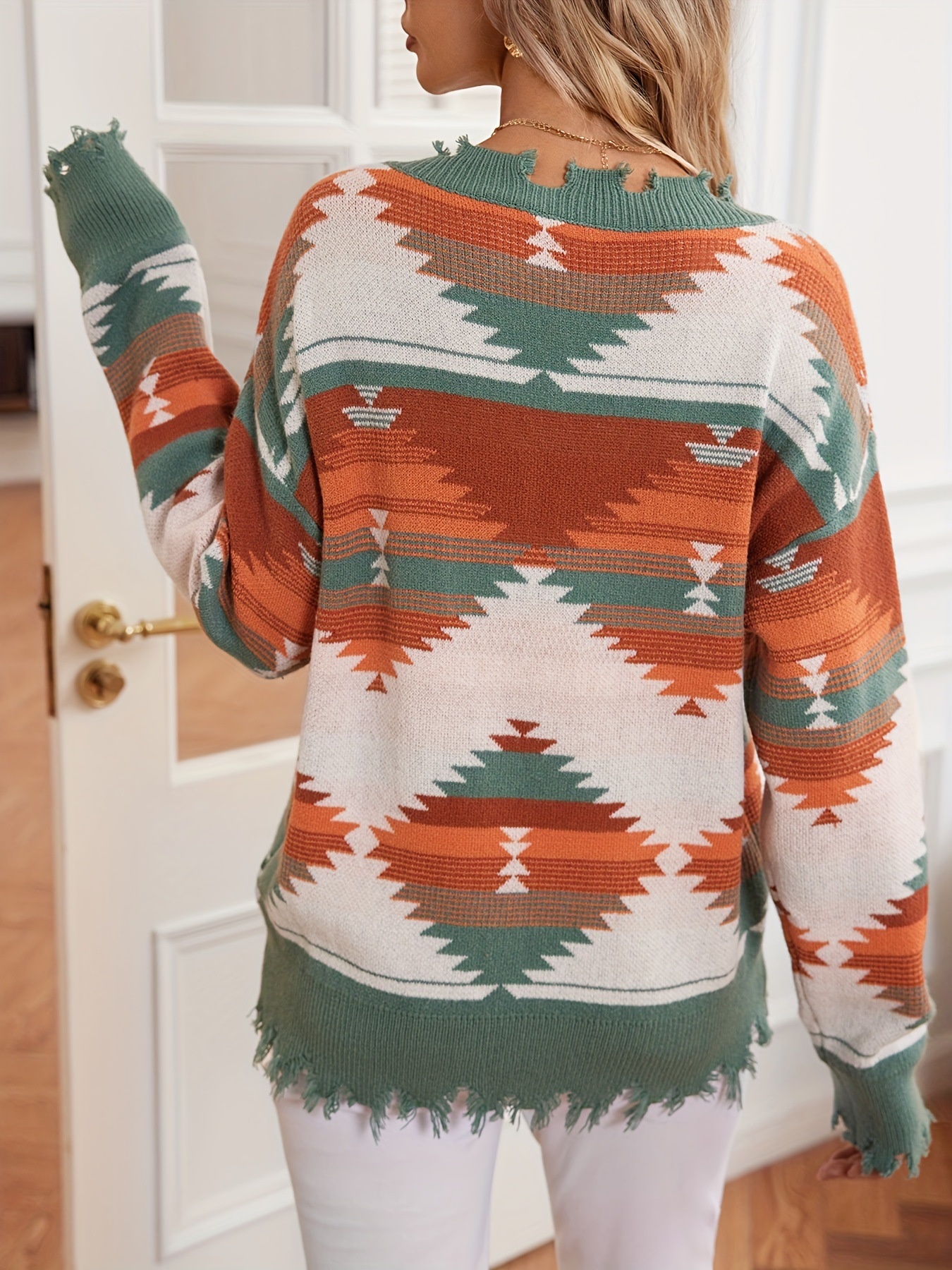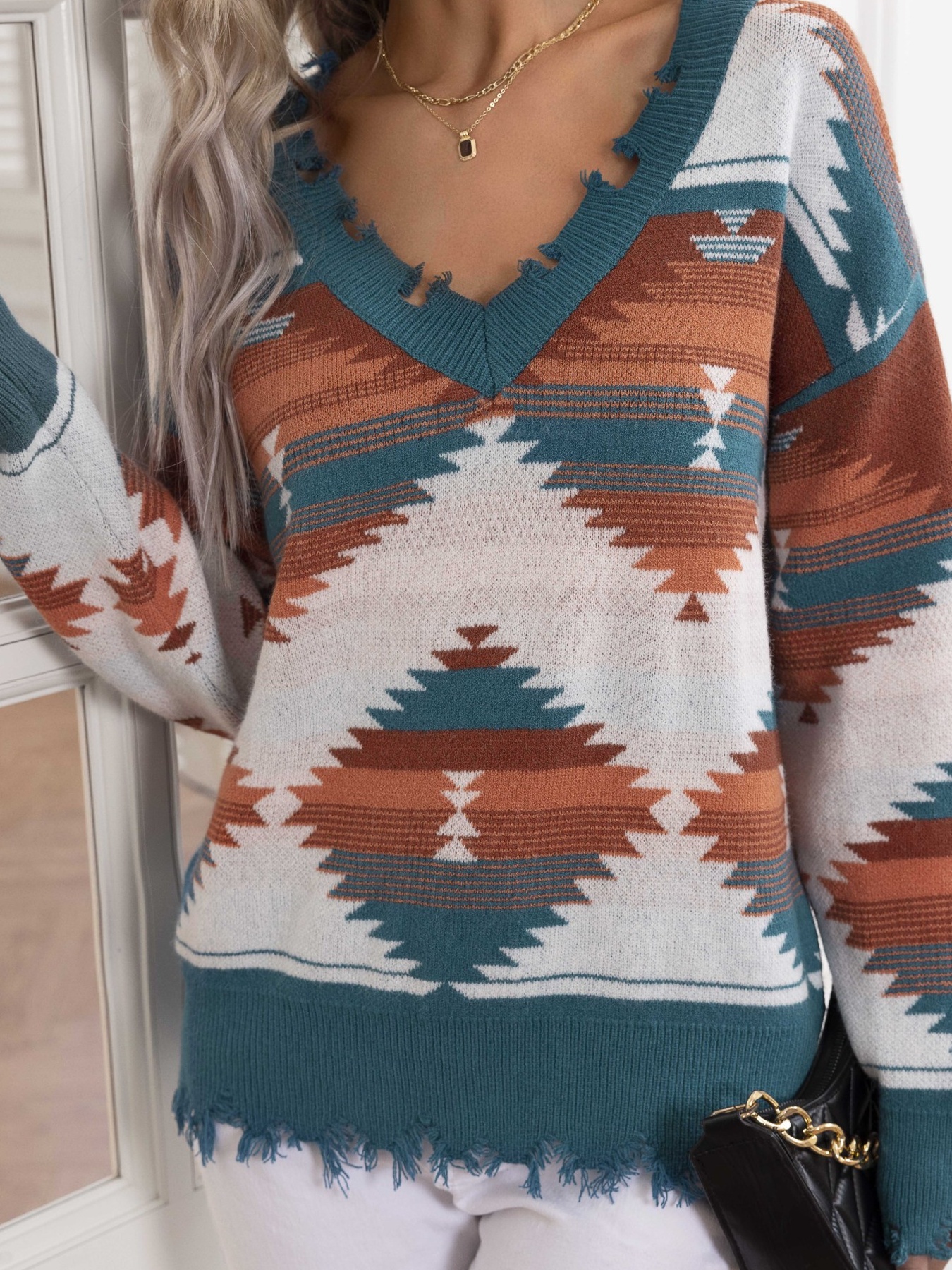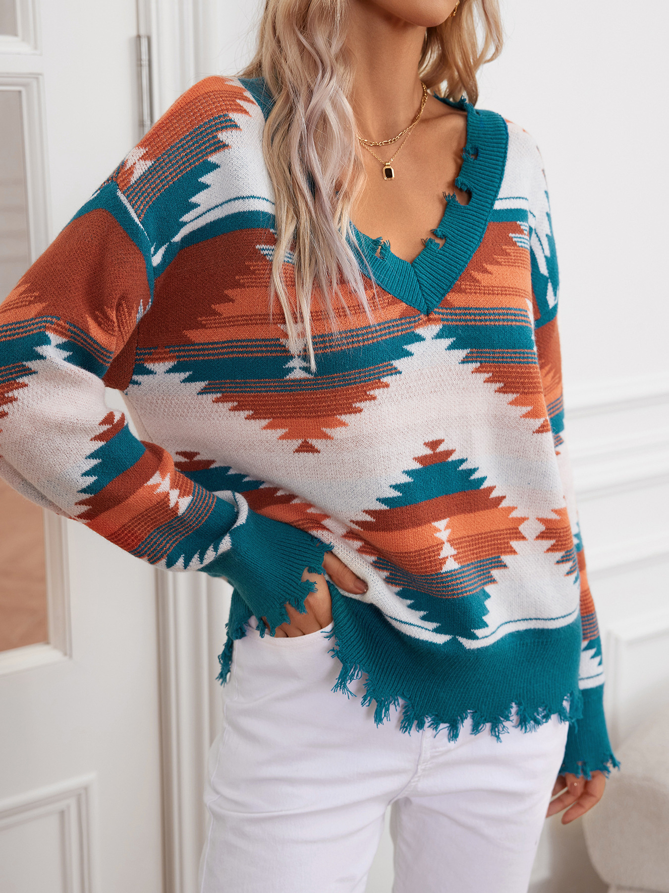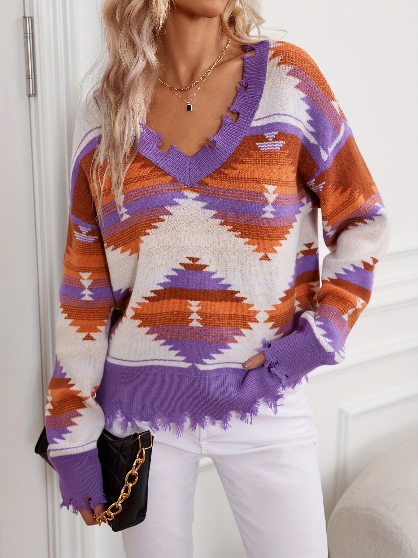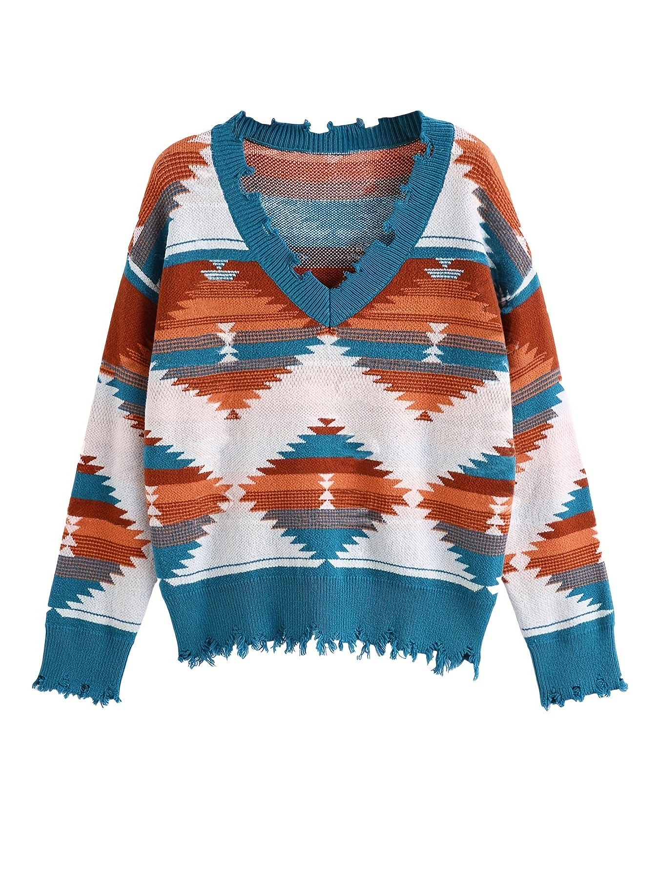 Geometric Frayed Hem V-Neck Long Sleeve Sweater