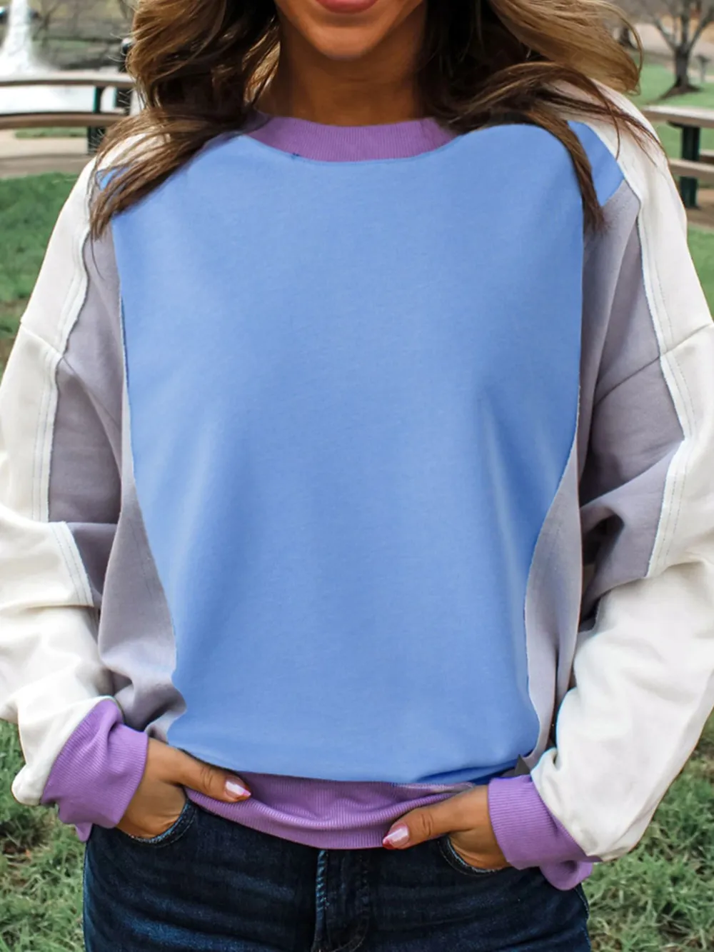 Exposed Seam Colorblock Patchwork Ribbed Trim Sweatshirt