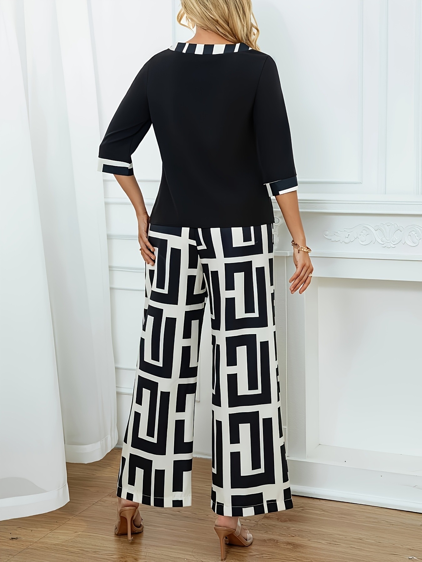Geometric Print Round Neck Top And Pants Two-Piece Set