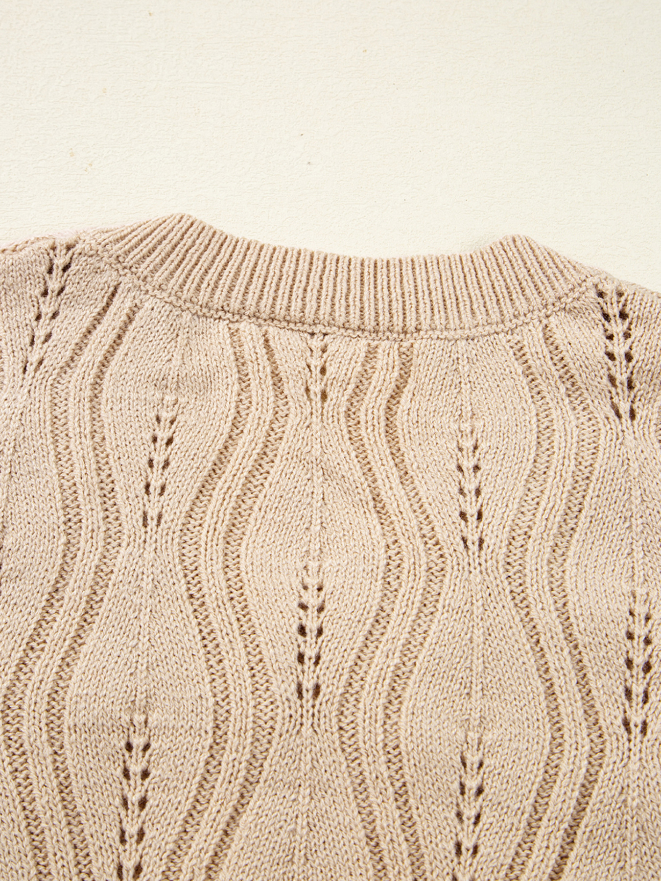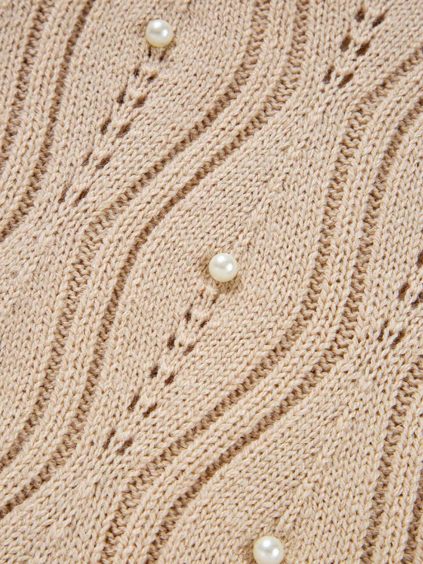 Pearl Beaded Pointelle Knit V Neck Lace Patchwork Sleeve Sweater