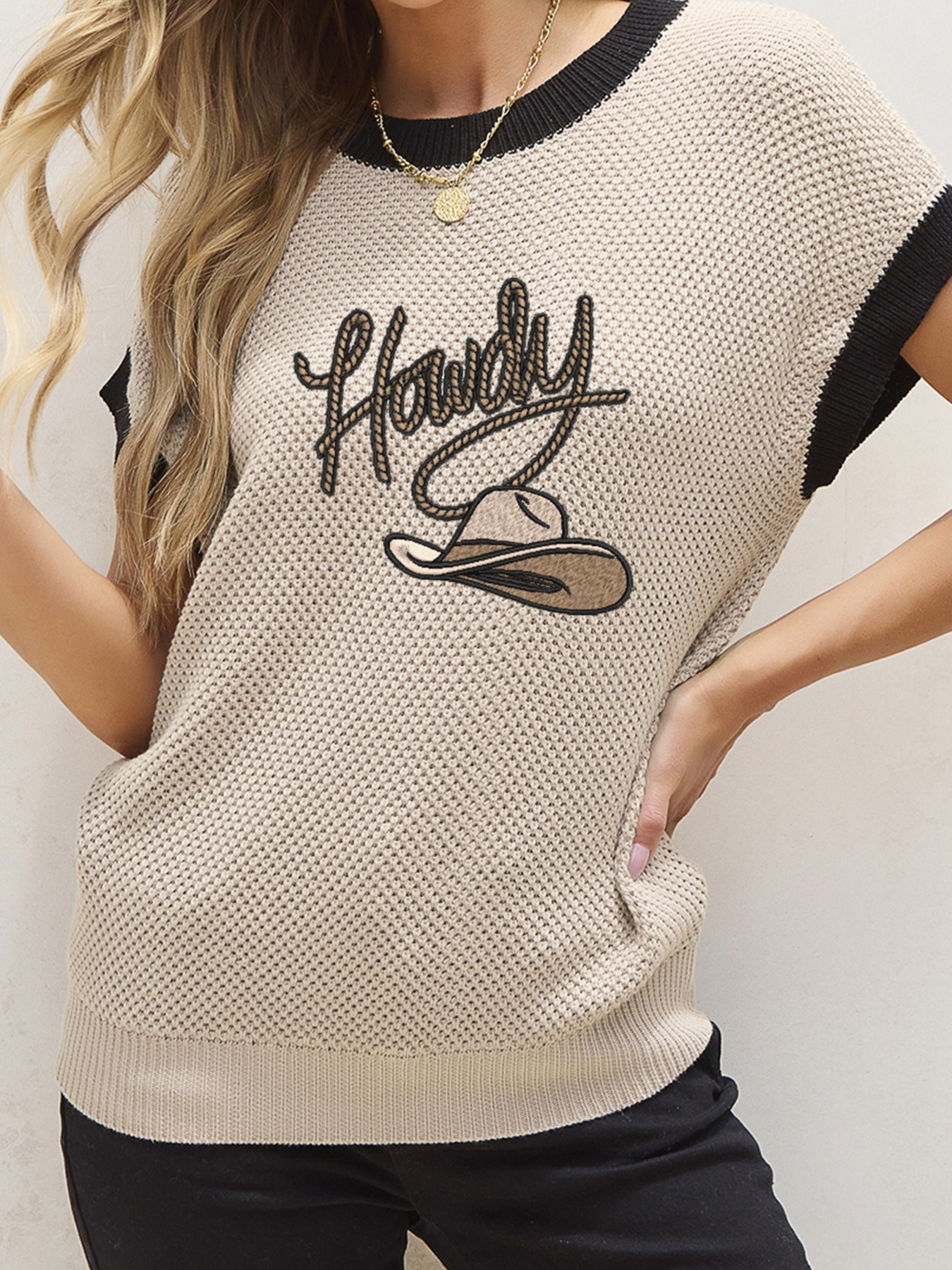 Howdy Cowboy Hat Embroidered Short Sleeve Sweater